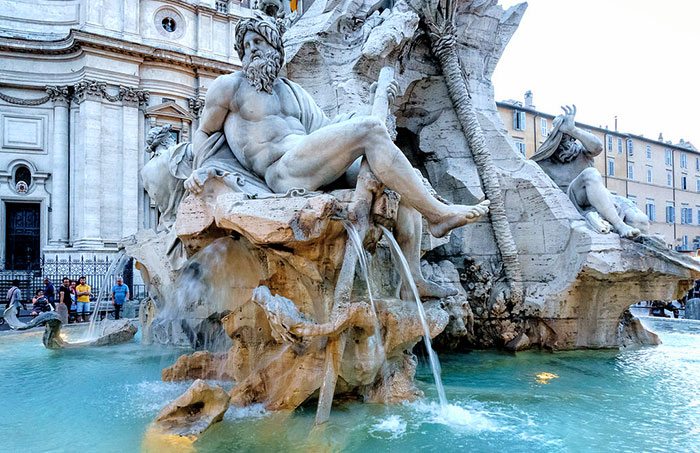 Adorning this fountain are four titans, which represent the rivers of the continents that were already known at that time. These are: